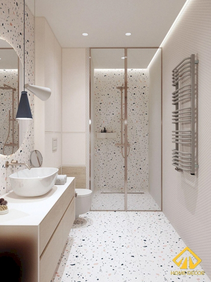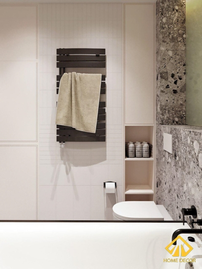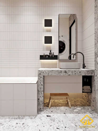 Trong Bản thiết kế căn chung cư 2 phòng ngủ với tone trắng nâu xen kẽ hot hit mà Home Decor thực hiện sẽ gồm có hai khu vực phòng vệ sinh hiện đại. Chủ yếu cả hai phòng đều có màu sắc trắng.