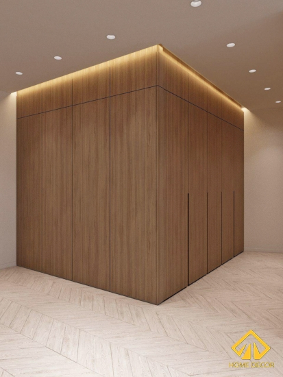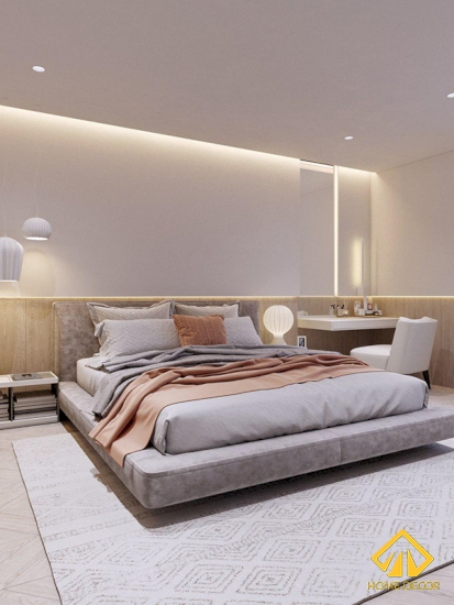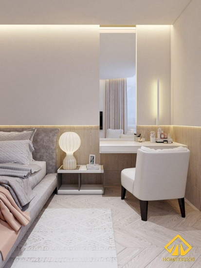 Xung quanh căn phòng đều được bao bọc bởi bức tường sơn trắng chống ẩm cùng với nền sàn nhà lát tấm gỗ nâu nhạt vô cùng tinh tế.
