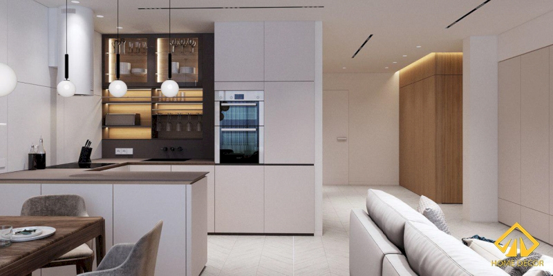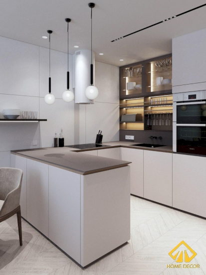 Bộ tủ dàn bếp này được sử dụng chủ yếu với màu sắc trắng, bền mặt bàn nấu nướng sẽ được làm với chất liệu mặt đá màu nâu giúp vệ sinh dễ dàng mà lại vẫn đáp ứng được đúng yêu cầu căn nhà mang phong cách hiện đại và nhẹ nhàng.