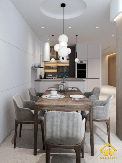 Bộ bàn ăn Home Decor lựa chọn mang đến cho căn phòng ăn nhà chị Hoa chính là dáng bàn gỗ vân nâu sắc nét cùng với những bộ 6 chiếc ghế bọc vải nhung có chân đỡ bằng gỗ. Nhờ có thiết kế này mà vừa tiết kiệm được không gian mà vẫn có thể sử dụng cho nhiều người đến ăn.