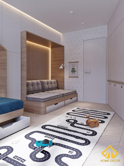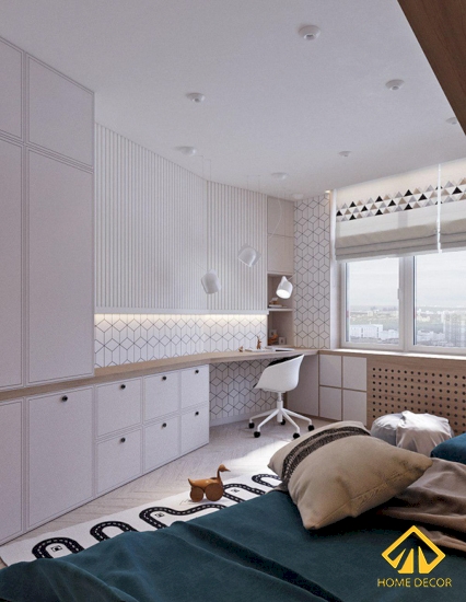 Và cuối cùng chính là căn phòng với thiết kế hoàn toàn độc đáo dành cho trẻ nhỏ. Trong căn phòng này đây, Home Decor chúng tôi đã tâm huyết rất nhiều với thiết kế giường và ghế ẩn sâu trong tường và bộ tủ để đồ được thiết kế nhô ra ngoài như thể bao bọc giường vật.