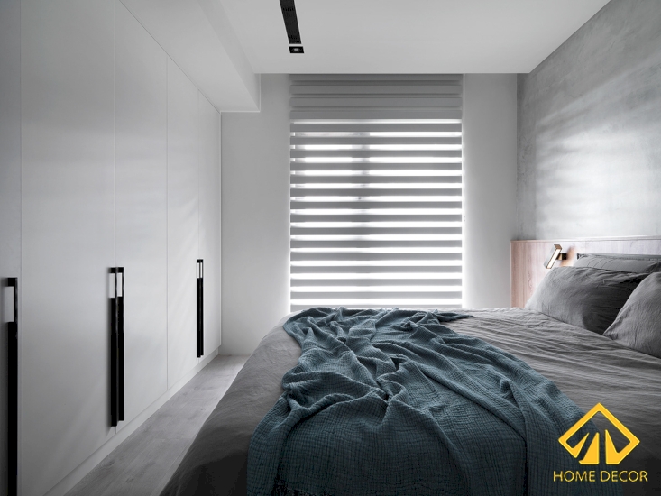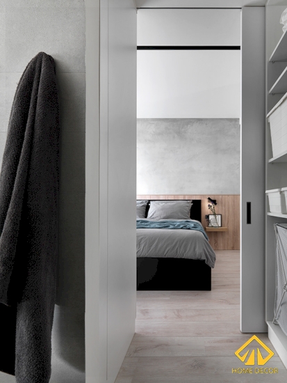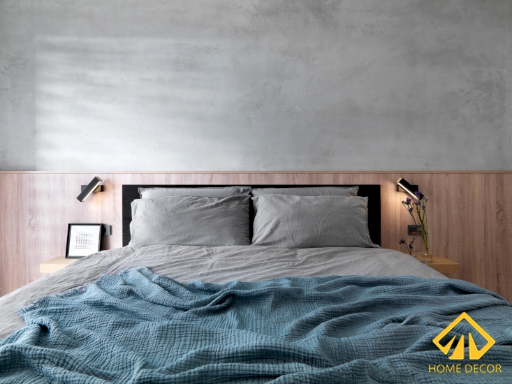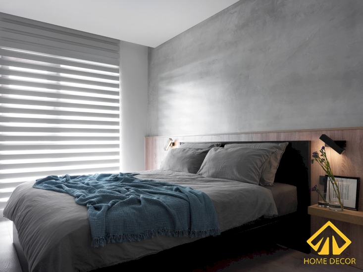Trong căn phòng ngủ này, Home Decor vẫn tiếp tục sử dụng tone màu xám là chủ đạo với bức tường trần xám trắng và nền sàn gỗ nâu nhạt giúp hai màu được hài hòa mà vẫn làm nổi bật đồ nội thất khác trong phòng.