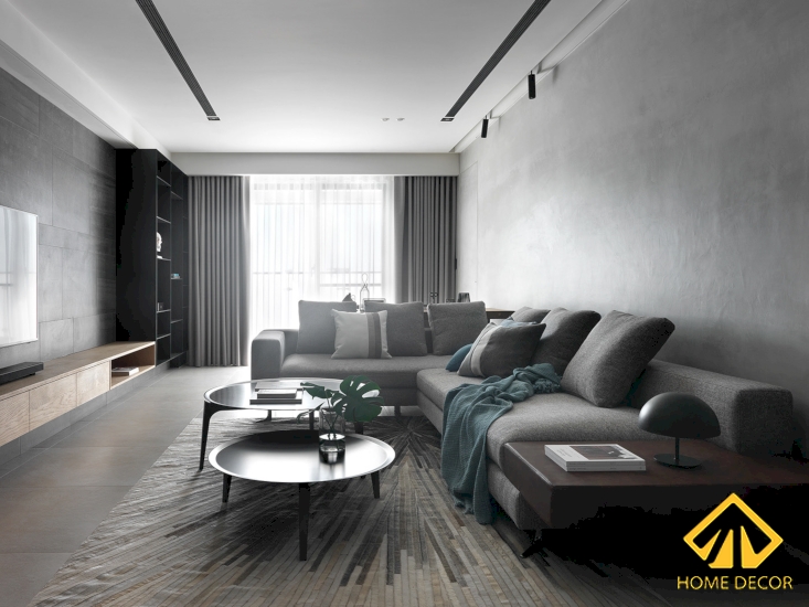 Căn phòng khách là nơi mà chúng ta tiếp đãi các vị khách quý ghé chơi nhà, chính vì thế mà nơi đây Home Decor đã thiết kế sắp xếp có không gian diện tích lớn nhất. Bước đến khu vực phòng khách này chúng ta có thể thấy được rất rõ màu sắc tối giản, cơ bản được thể hiện qua nền sàn nhà lát gạch xám cùng với bức tường và trần hai màu trắng và xám nhạt. Để căn phòng khách tránh bị màu chết chìm thế nên Home Decor đã làm mở rộng thêm khung cửa sổ lớn hơn cao áp sát trần nhằm mang đến nguồn ánh sáng tươi mới cho căn phòng.