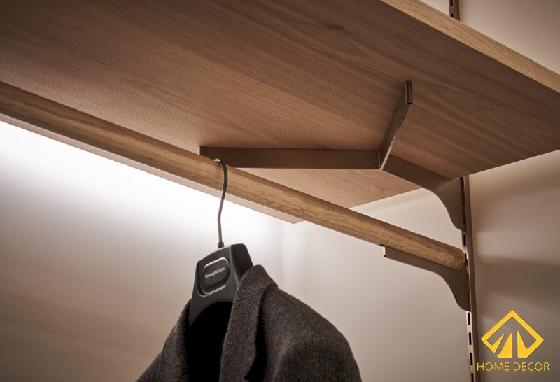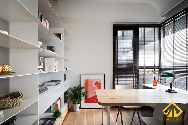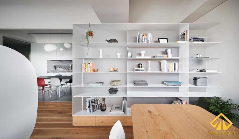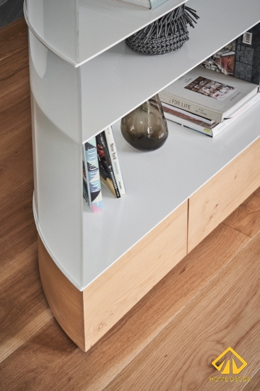 Để đảm bảo được sự đồng nhất trong bản thiết kế căn chung cư này nên chiếc kệ tủ sách này được chúng tôi sử dụng bằng chất liệu gỗ phủ sơn trắng lên trên bề mặt, phần thân dưới thì có màu nâu sáng thu hút.