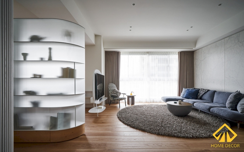 Chiếc ghế sofa màu xanh dáng chữ L được Home Decor thiết kế và sắp xếp đặt ngay cạnh chiếc cửa kính cao áp sát trần. Vừa mang đến bầu không trí trong lành của ngày mới mà đang gửi đến căn chung cư một nguồn ánh sáng tự nhiên.