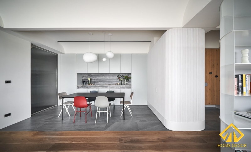 Ngay bên cạnh không gian phòng tiếp khách thì chính là khu vực gian bếp nấu nướng. Nơi đây để tạo dựng được phân chia hai căn phòng khác nhau nên Home Decor đã lựa chọn sử dụng nền sàn đá xám nhám để tạo sự khác biệt. Đồng thời tủ bếp chúng tôi cũng lựa chọn sử dụng mẫu gỗ có tone màu trắng sáng giúp vừa hiện đại, trẻ trung mà cũng vô cùng tao nhã.