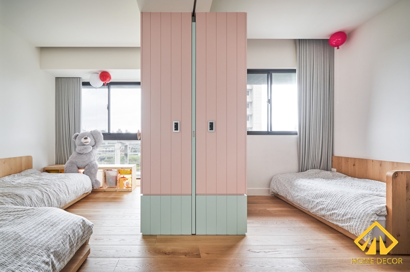 Tiếp đến là căn phòng ngủ của bé nhà anh Huy. Căn phòng được phân chia thành hai không gian với một bên là giường đệm dáng chữ L và một bên dáng giường ngủ chữ I thông thường. Tuy nhiên cả hai khu vực được phân tách bằng một chiếc tủ quần áo có màu hồng xanh nhạt vô cùng bắt mắt của trẻ.
