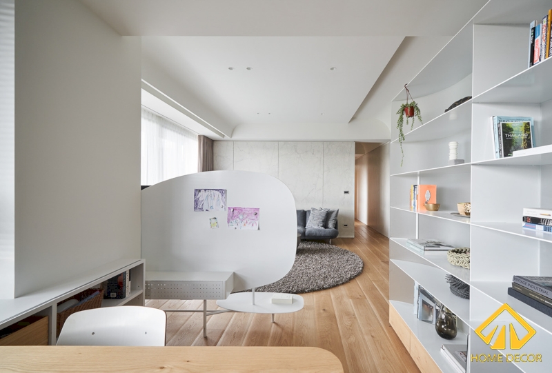 Tại khu vực bàn làm việc này đã được chúng tôi bao bọc phân chia bằng một kệ tủ có đường vòm giúp nhìn chung sẽ thấy được nét đẹp trẻ trung, hiện đại mà lại tiện nghi.