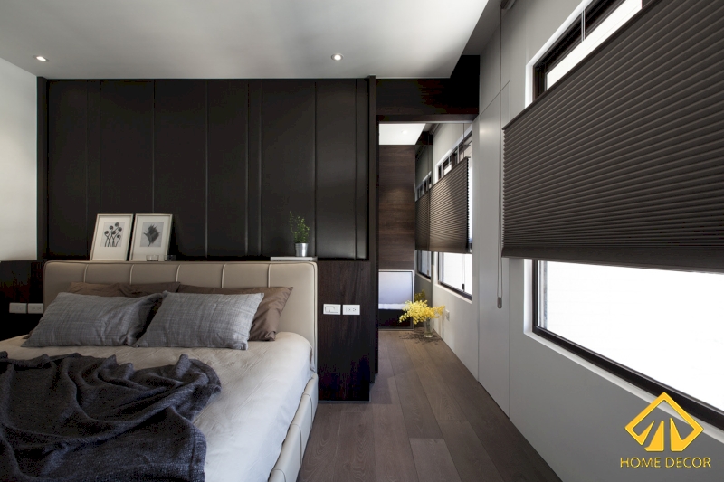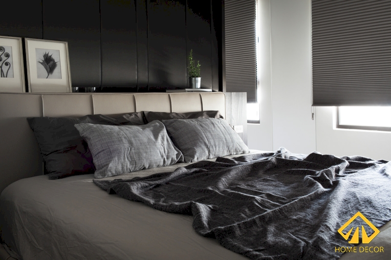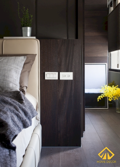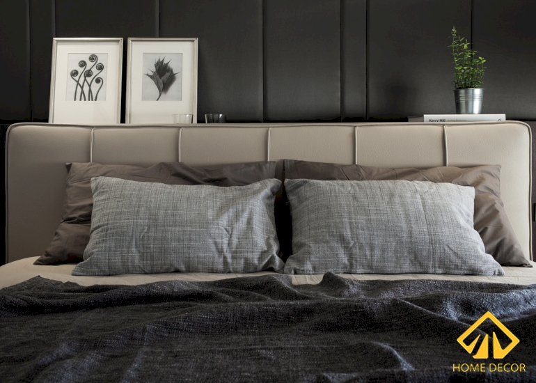 Chiếc giường mà chúng tôi lựa chọn được bọc bên ngoài bằng lớp da màu be vô cùng hiện đại và ấm cúng khi được đặt trên nền sàn lát gỗ nâu đậm. Bên trên đầu giường còn là tấm vách ngăn bằng da dùng để phân chia hai khu vực có những họa tiết thiết kế độc đáo và ấn tượng.