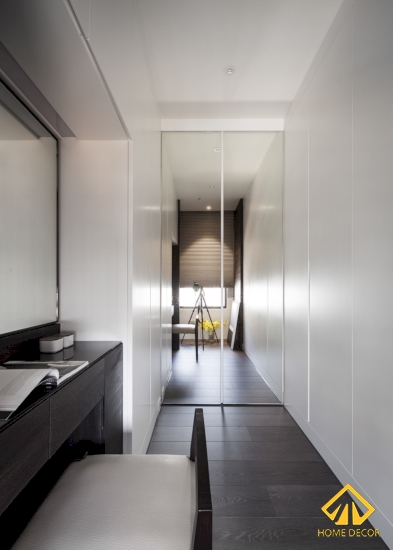 Phía khu vực bên kia là nơi được bao bọc xung quanh bằng toàn bộ tủ quần áo có cánh tủ màu trắng giúp nổi bật hoàn toàn trên nền sàn. Để tránh bị lạm dụng tone màu trắng quá nhiều nên Home Decor lựa chọn ngay một chiếc bàn làm việc nhỏ gọn vừa để làm mà cũng vừa để trang điểm nữa. Bộ bàn này được thiết kế trơn với tone màu gỗ đen nâu rất ấn tượng bởi vẻ bề ngoài mộc mạc mà lại toát lên nét hiện đại trong đó.
