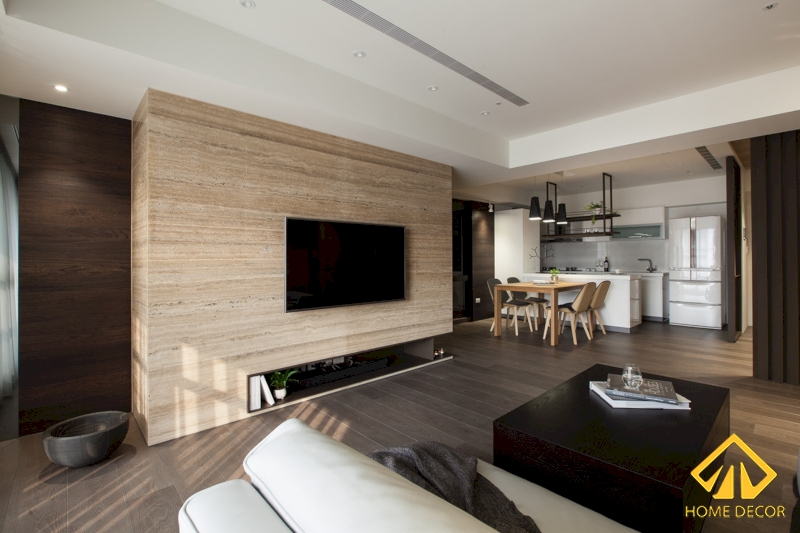 Cùng với đó chính là tấm vách ngăn vừa dùng để phân chia khu vực mà đồng thời còn là nơi để treo tivi và gói gọn kệ tủ tivi đặt phía bên dưới nữa. Nhờ đó mà càng tiết kiệm, tối ưu được không gian bỏ trống.