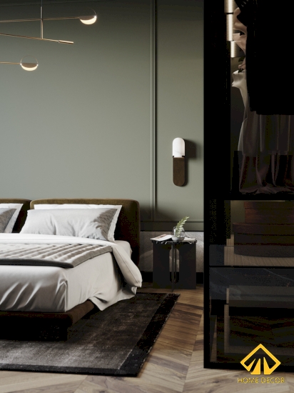 Vào bên trong căn phòng thì nơi chúng ta để ý đầu tiên chính là chiếc giường ngủ cỡ lớn đang được bao bọc bởi bức tường sơn trơn pháo chỉ màu xanh xám và khung cửa sổ lớn đặt bên cạnh.