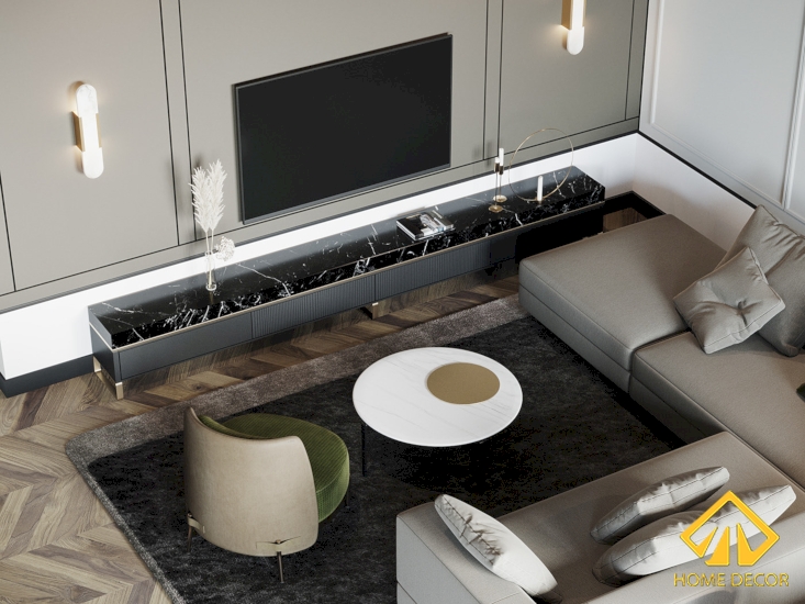 Khác biệt với bức tường bao quanh thì tại tường treo tivi đã được thiết kế sơn phủ màu xám nhằm tạo sự độc đáo riêng. Kệ tivi lần này được Home Decor thiết kế với sự kết hợp đồ gỗ nội thất phủ đen ở thân tủ và bề mặt làm bằng đá cẩm thạch marble màu đen rất tinh tế.