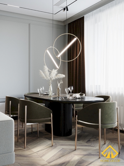 Còn đối với chiếc bàn ăn chung này thì Home Decor đã lựa chọn dáng bàn dài tròn Elip bằng gỗ cùng vị trí đá cẩm thạch hình tròn ở cạnh mép bên bàn. Với sự thiết kế đặc biệt này càng giúp không gian chung trở nên sang trọng và tinh tế nhờ sự tác động của bộ đôi đèn chùm treo ở trên.