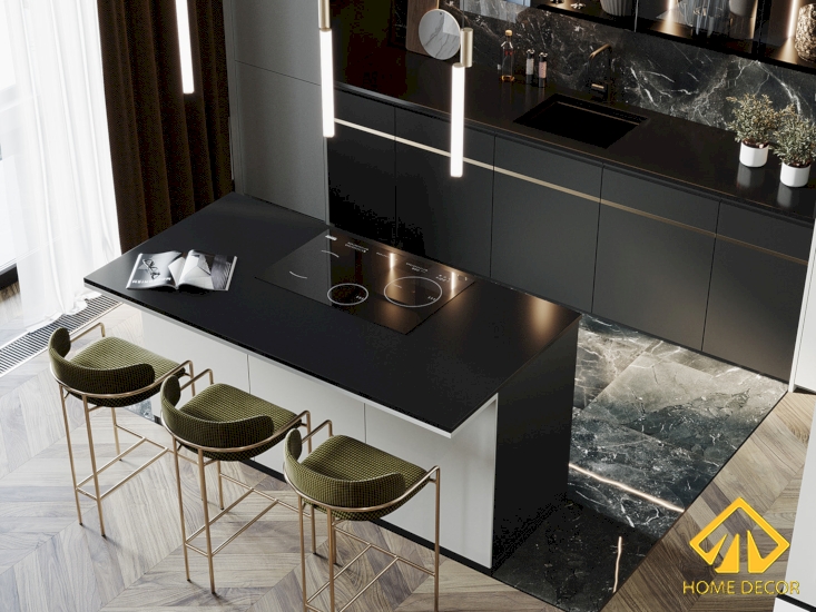 Bộ tủ bếp lần này Home Decor thiết kế quả thực rất ấn tượng với chúng bao trọn hoàn toàn không gian bếp. Bên ngoài được thiết kế bằng gỗ phủ trắng còn phía bên trong sẽ là khu rửa bát, chế biến với gạch vân đá đen tinh tế.