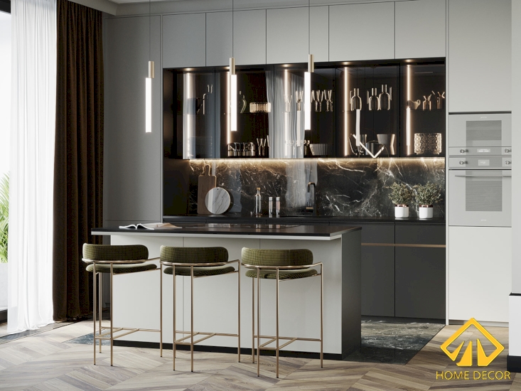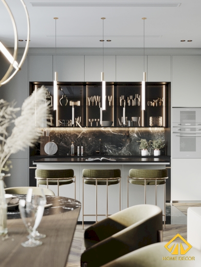 Không những vậy, phía tủ trên còn được lắp cửa kính mở cường lực dùng để bày biện đồ dùng, ly cốc, chai rượu,..