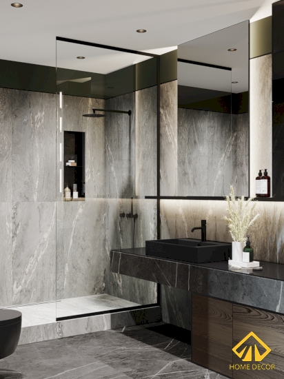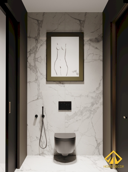 Hai căn phòng vệ sinh đều đã được Home Decor thiết kế vô cùng sang trọng và hiện đại bằng những tấm gạch đá cẩm thạch marble màu đen và trắng.