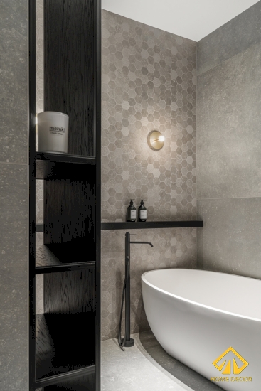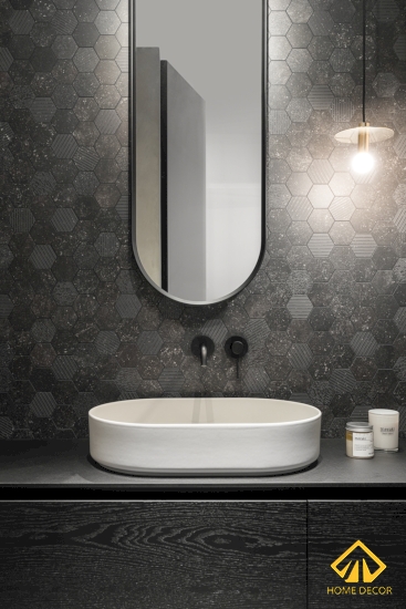 Ở căn phòng vệ sinh đầu tiên sẽ được thiết kế ấn tượng với các viên gạch nhỏ hình lục giác xếp ngay ngắn với nhau bằng các tone màu xám đậm, nhạt, đen,..