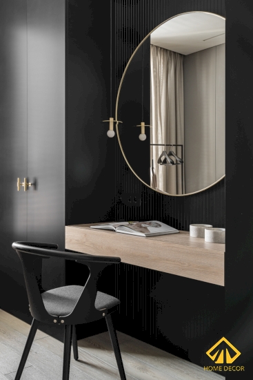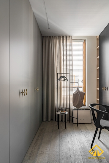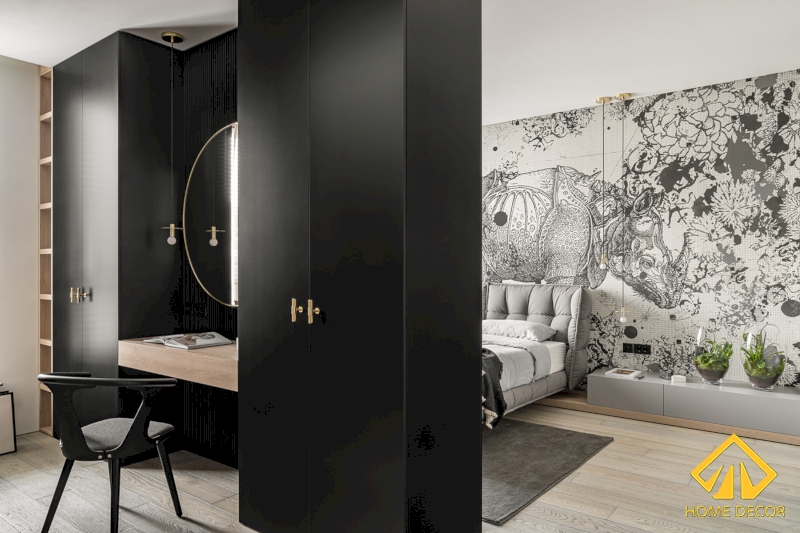 Đằng sau của vách tường treo tivi đó chính là không gian phòng tủ quần áo cùng với bàn trang điểm. Tất cả đều được sử dụng bằng màu sắc trung tính như màu xám, trắng và đen.
