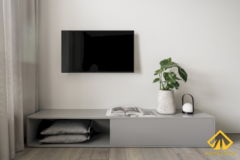 Đối diện với gường ngủ lớn đó chính là chỗ kệ để tivi. Nhằm tạo nên được sự đồng nhất chung với cả phòng nên Home Decor đã sử dụng chủ yếu bằng tone màu xám và tối giản mọi thứ bằng cách tránh để bày bừa mọi đồ trang trí quá nhiều trên đó. Thay vào đấy, Home Decor sẽ chỉ để chậu cây xanh, cuốn quyển sách và đèn ngủ cầm ngay mà thôi.