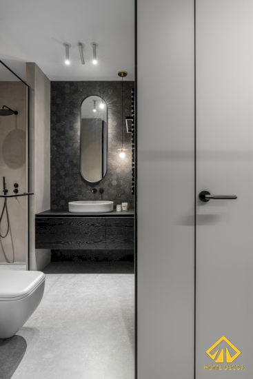 Trong căn chung cư của anh Hùng, chúng tôi đã thiết kế ra hai căn phòng vệ sinh hiện đại và có chung cùng một ý tưởng sử dụng tone màu xám, đen, trắng.