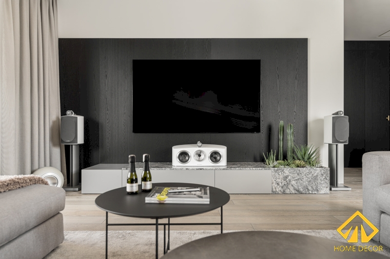 Vách ngăn tivi Home Decor đặt lên trên chính là bằng chất liệu gỗ đen ép ở nền trắng sẽ càng tạo nên được điểm nhấn cùng với tối giản được mọi màu sắc trong nhà hơn. Để bày biện thêm cho căn phòng thêm nét hiện đại mà vẫn đảm bảo được yêu cầu sử dụng màu trung tính nên Home Decor trang trí các đồ thiết bị điện tử mà anh Hùng yêu thích cùng với đèn chùm đen ấn tượng.