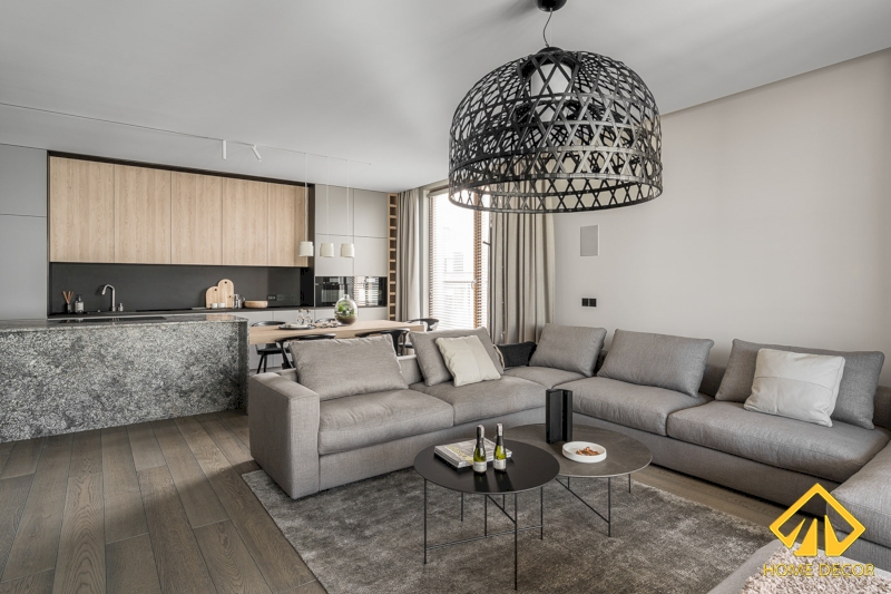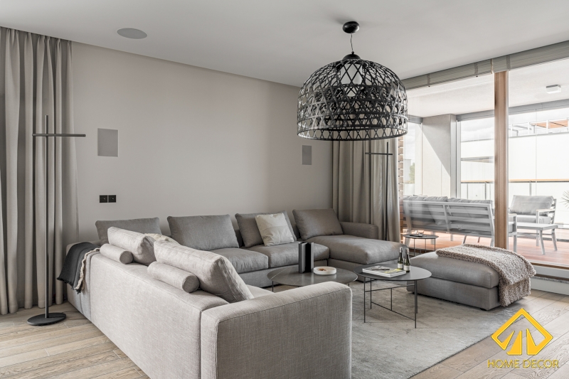 Trong căn phòng khách này, Home Decor đã sơn phủ tường và trần nhà một lớp sơn màu trắng xám nhè nhẹ. Và kết hợp chung cùng với sàn nền nhà bằng gỗ nâu sáng với đường vân rõ ràng sắc nét.