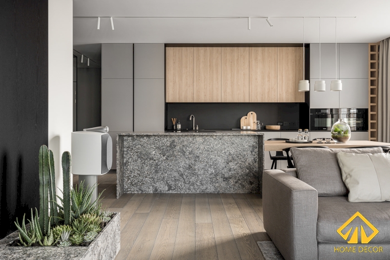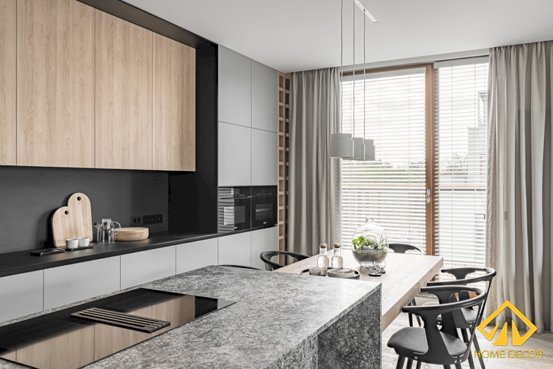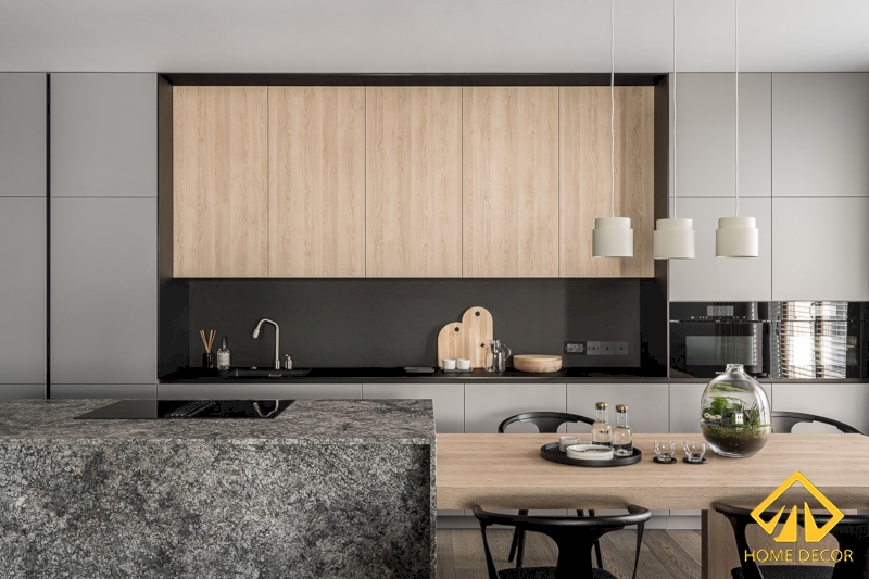 Chiếc bàn đá bếp nấu ăn được Home Decor sắp xếp thông minh với bộ bếp từ ấn dưới bề mặt đá. Từ đó mà tiết kiệm được thêm không gian mà cũng vô cùng tiện nghi. Đặt liền với đó chính là chiếc bàn ăn bằng chất liệu gỗ nâu sáng giống như tủ bếp nhằm mang đến sự đồng nhất chung của cả gian bếp.