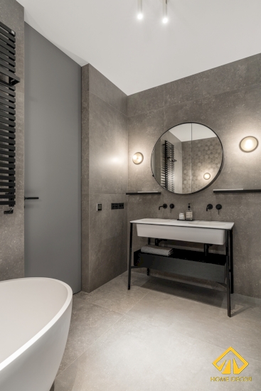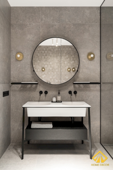 Còn ở căn phòng vệ sinh thứ 2 thì sẽ nghiêng về tone xám, trắng hơn. Tại đây, Home Decor sử dụng nhiều bằng chất liệu gạch đá to vân cùng với các viên gạch đá nhỏ hình lục giác nhằm mang đến hai không gian có sự đồng nhất chung với nhau.