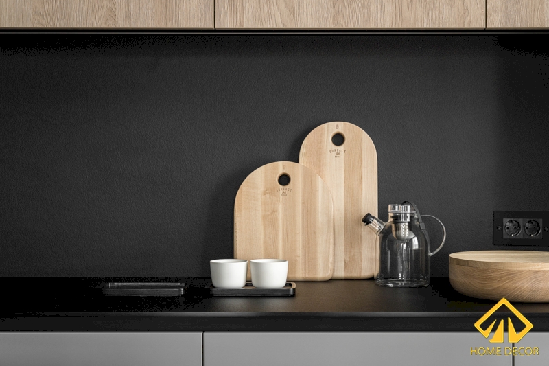 Ở đây tủ dàn bếp Home Decor thiết kế với dáng cao áp sát trần cùng với các khung cánh cửa mở đều không có núm mà thay vào đó chỉ kéo mở bằng chỗ ở bên dưới cánh. Tất cả đều nhằm mục đích tạo nên sự tối giản, hiện đại và không có cảm giác đó là chiếc tủ bếp.