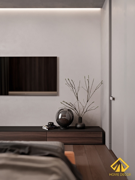 Đối diện là sẽ chiếc tivi được lắp thẳng lên trên bề mặt tường, kệ tủ tivi cũng đã lựa chọn bằng chất liệu gỗ nâu bọc viền màu đen có dáng thân dài và hẹp. Đã tạo nên một căn phòng ngủ hiện đại mà vẫn tối giản được màu sắc.