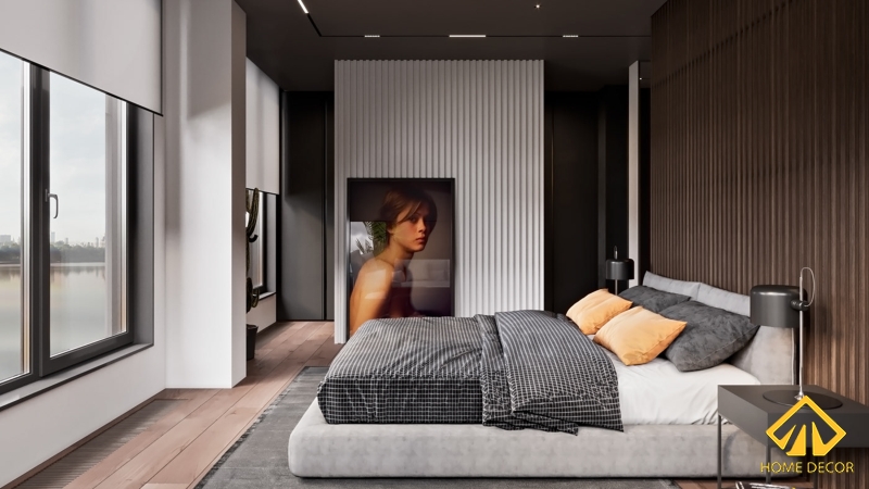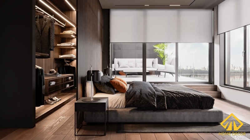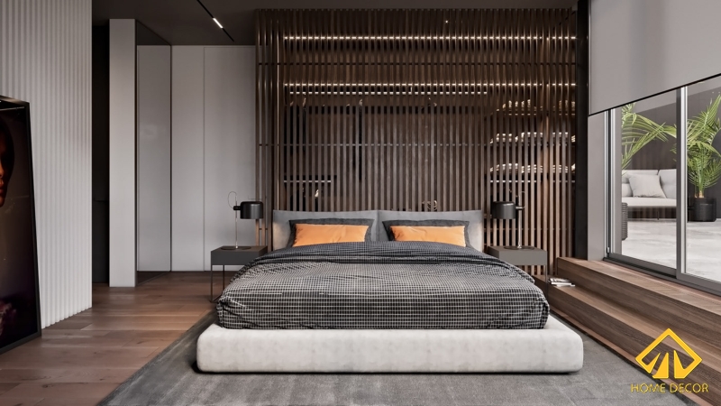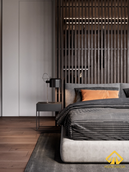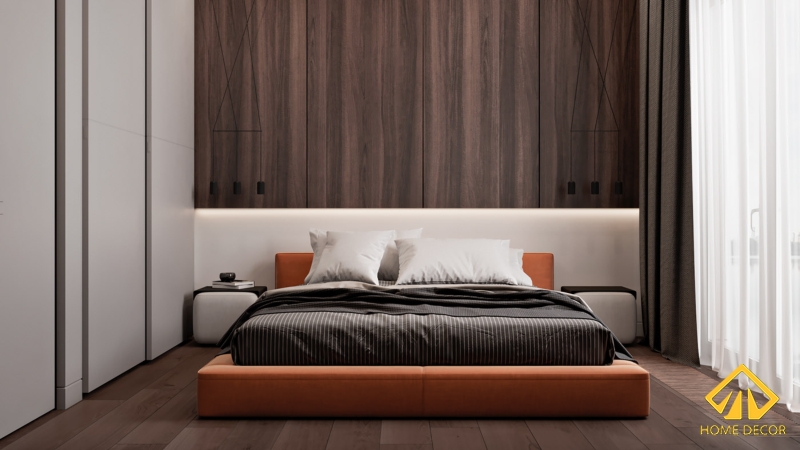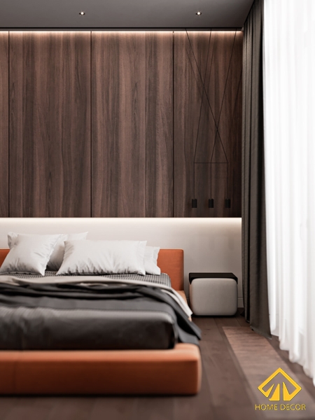 Phòng ngủ này Home Decor tận dụng tone màu nâu gỗ cùng với bức tường màu trắng giúp cân bằng lại được màu sắc hơn. Chiếc giường ngủ mà chúng tôi lựa chọn cho anh chị là loại giường bằng vải nhung thô màu xám trắng đặt ngay ngắn trên tấm vách nền màu nâu vân kẻ tạo nét nổi bật. Đằng sau tấm vách đó chính là khu vực tủ đồ quần áo vừa tiết kiệm được không gian mà cũng mang đến cảm giác ấn tượng.