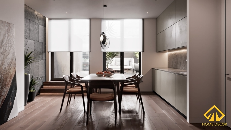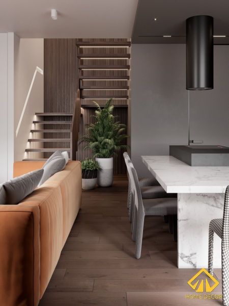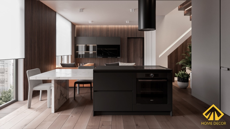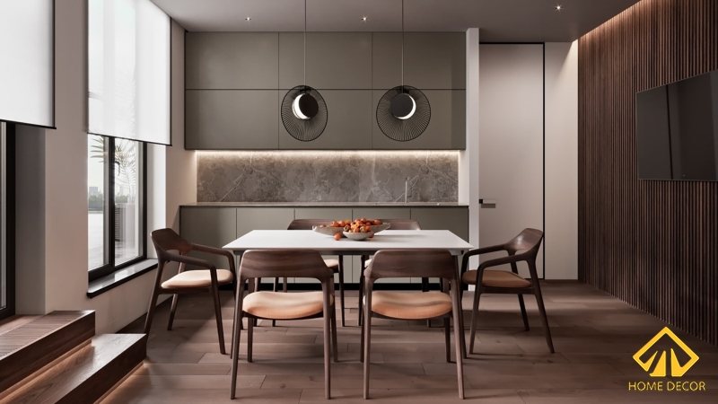Khu vực phòng ăn được sắp xếp ngăn ngắn ở đằng sau chiếc ghế sofa của không gian phòng khách. Mang đến cho tổng thể tầng 1 này một sự hài hòa, đồng nhất với nhau hơn. Bộ bàn bar mà Home Decor sử dụng trong bản thiết kế nội thất biệt thự này chính là tấm đá vân Marble - thể hiện cho sự hiện đại, tao nhã. Không những vậy với mong muốn tối đa hóa được màu sắc nhất có thể nên liền kề với bàn bar đó chính là chiếc bàn được lắp thêm thiết bị nấu nướng bếp lò bên dưới.