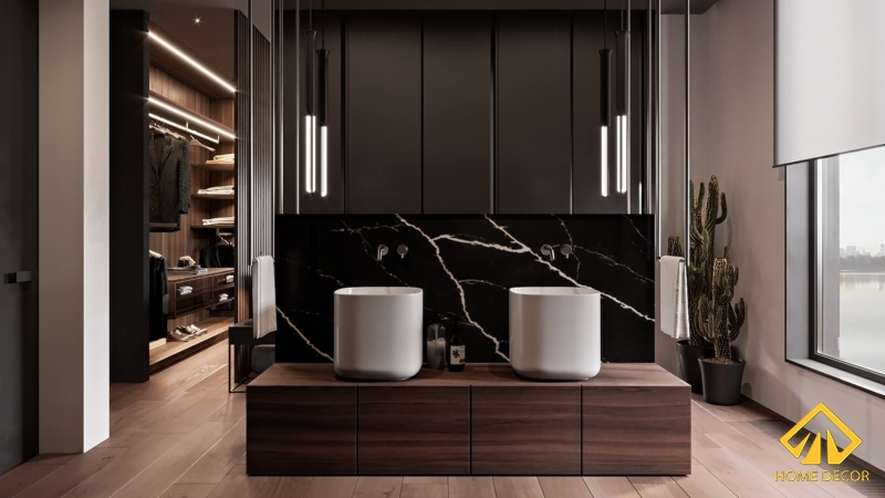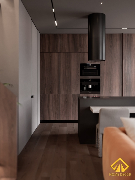Phía mặt đằng sau cũng được thiết kế với tấm vách tủ màu nâu gõ có những đồ thiết bị khác dáng chìm sâu.