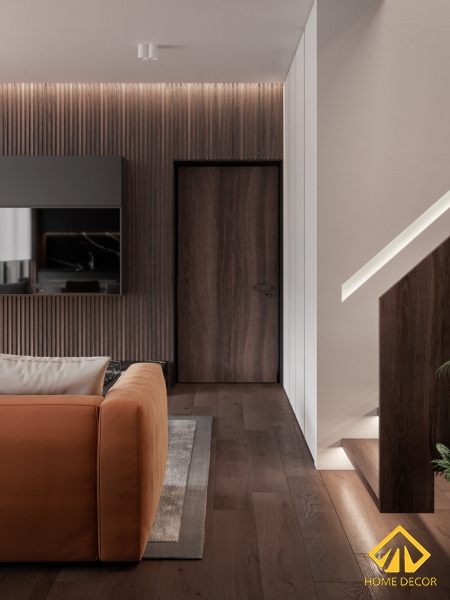 Chiếc tivi được thiết kế gắn ngay lên trên tường tấm vách gỗ kẻ màu nâu vừa tạo độ sang trọng mà cũng tối giản màu sắc nhất có thể. Khác với những chiếc kệ tivi thông thường, thì tại thiết kế nội thất căn biệt thự tối giản mà lại hiện này của chị Trang sẽ được lắp chiếc kệ tủ tivi lên trên tivi.