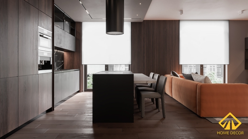 Bên cạnh chiếc bàn bar này thì chị Trang cũng cho Home Decor thiết kế thêm một không gian phòng bếp nữa, nơi đây sẽ có đầy đủ đồ dùng bếp nướng hơn. Tại đây tủ bếp được thiết kế dáng cao áp sát trần có tone màu xám đậm giúp tối giản màu sắc. Bộ bàn ăn cũng được sắp xếp nằm giữa căn phòng giúp xua tan được khoảng trống xung quanh đây.