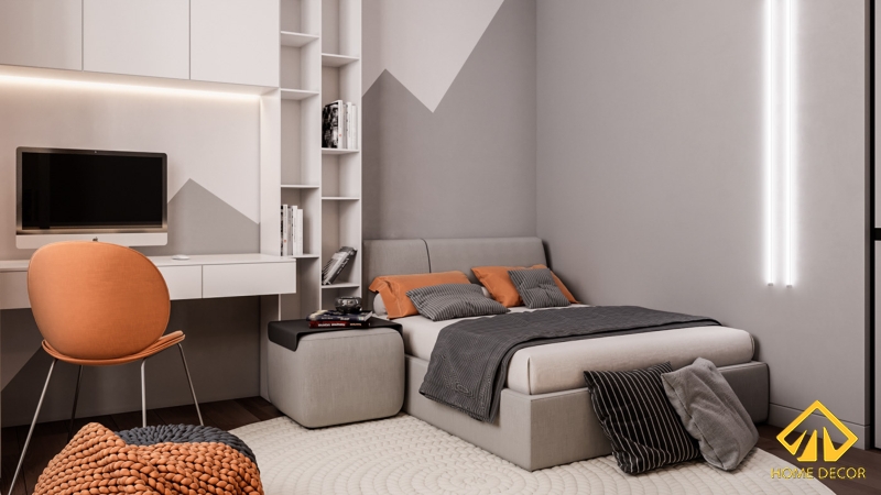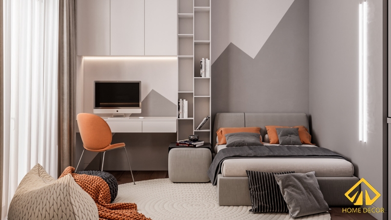 Cuối cùng đó chính là phòng ngủ của trẻ nhỏ nhà chị Trang, trong căn phòng này chủ yếu sẽ bớt sử dụng tone màu nâu gỗ đi mà thay vào đó là các bức tường sơn màu trắng và xám. Điểm thêm vài nét nổi bật trẻ trung đó là đồ dùng như gối, đệm ngồi, ghế,..có màu sắc cam năng động.