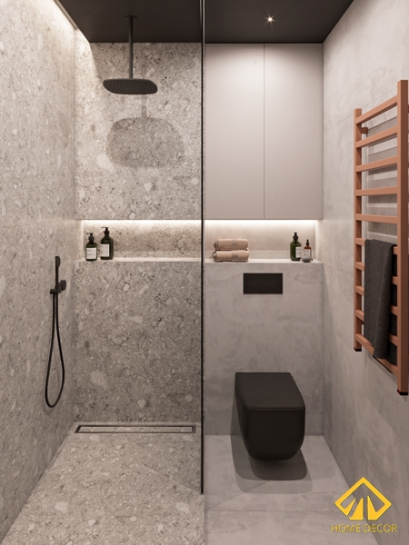 Phòng vệ sinh trong phòng ngủ lớn này rất thú vị ở chỗ, bồn rửa mặt không đặt nằm bên trong phòng mà được thiết kế đặt ngay trước cửa lối đi vào phòng. Bên trong được phân chia rõ ràng hai khu vực phòng tắm đứng và bồn vệ sinh bằng hai loại gạch màu vân đá và trơn khác nhau.