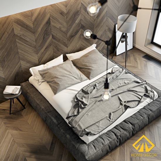 Căn phòng ngủ được thiết kế đặt ngay bên cạnh không gian phòng khách bởi là nơi có thể đón nhận được nguồn ánh sáng và bầu không khí trong lành của thiên nhiên. Nơi đây, đặc biệt ấn tượng với kiểu thiết kế độc đáo khi tấm gỗ cũng đang được lát trên tường tạo điểm nhấn cùng với thay thế tựa đầu giường ngủ.