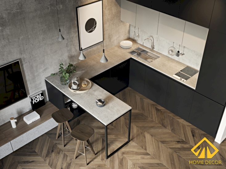 Ngay cạnh đó chính là không gian bếp nấu nướng của chị Nhi. Với nhu cầu sử dụng cũng không quá nhiều đồng thời diện tích căn hộ có giới hạn nên Home Decor lựa chọn ngay mẫu thiết kế dáng chữ U.