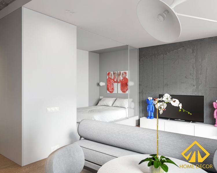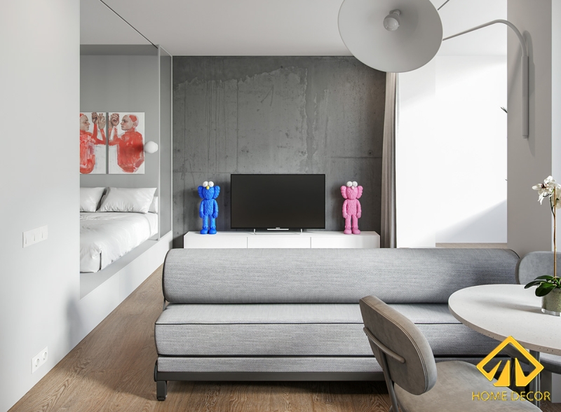 Tại sao mà Home Decor lại nói thiết kế phòng ngủ như trong chiếc hộp? Đơn giản là chúng tôi sử dụng tận dụng ngay khoảng trống của phòng khách để làm một phòng ngủ nhỏ gọn được bao bọc xung quanh bằng tấm cửa kính to và bức tường trắng. Tấm cửa kính to đó sẽ được che kín lại bằng tấm rèm rộng tone màu xám y như đồ nội thất bên ngoài phòng khác. Nhằm tạo nên nét đẹp tối giản, độc đáo có thể nằm hướng xem ra bên ngoài mà vẫn giữ được sự riêng tư kín đáo.