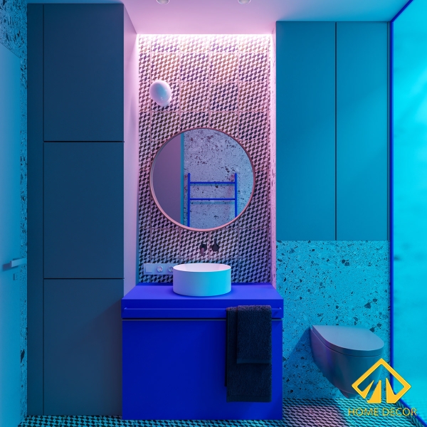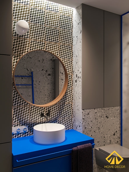 Có lẽ, nơi đây thể hiện rất rõ sự cá tính, độc đáo của anh Bình trong bản thiết kế chung cư này. Để vừa tối giản mà song song với đó vẫn tạo được nét riêng hiện đại và cá tính nên Home Decor sử dụng ngay tone màu xanh dương làm điểm nhất cho phòng vệ sinh.