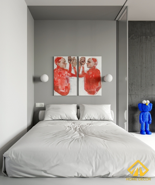 Tường mà chúng tôi lựa chọn là bức tường trắng được thiết kế phủ lớp sơn xám dọc theo đường tấm kính cửa mờ nhỏ ở đầu giường. Nhờ sự sắp xếp bố trí như vậy mà đã tạo nên không gian trong phòng không bị quá lu mờ một màu. Chiếc giường ngủ mà Home Decor sử dụng đơn giản chỉ là loại giường đệm sát sàn có màu sắc trắng chủ đạo.
