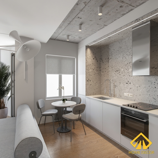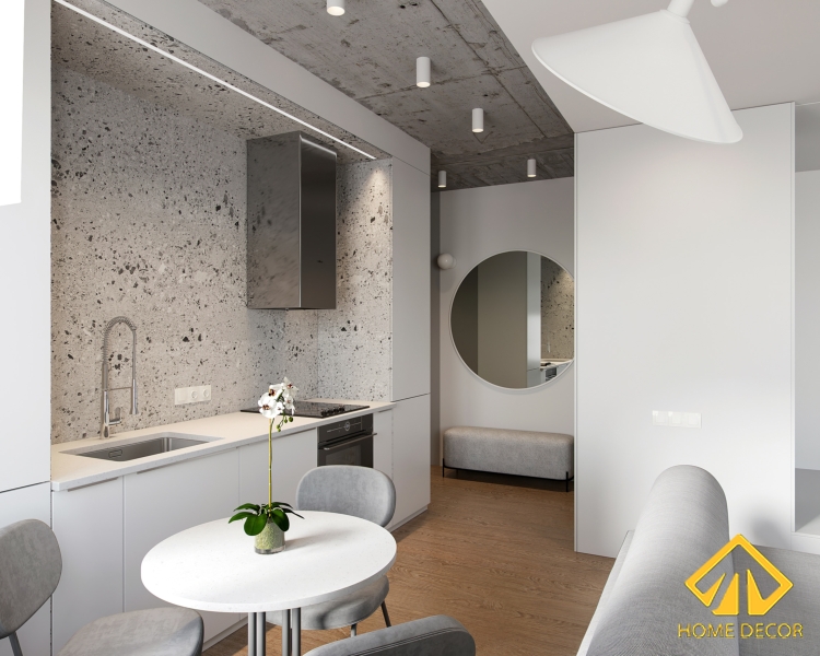 Trong dàn tủ bếp này được khoét phần giữa làm khu vực nấu nướng, rửa bát với mọi thiết kế theo dáng chìm. Bàn ăn Home Decor lựa chọn cho căn bếp nấu ăn nhỏ xinh này chính là mẫu bàn dáng tròn màu trắng. Để tương xứng với tone màu tổng thể tối giản nên chiếc ghế tựa bốn chân mà chúng tôi chọn vẫn sẽ có tone màu xám như bộ ghế sofa.