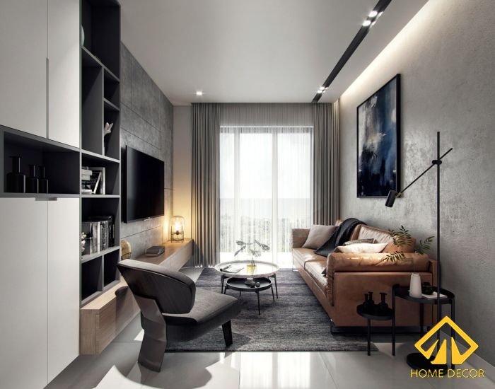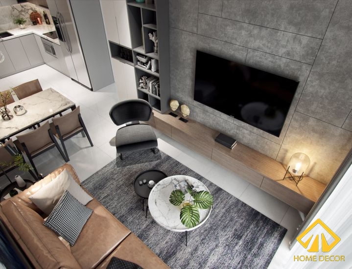 Để làm nổi bật bên trên nền trắng xám thì Home Decor đã lựa chọn sử dụng chiếc ghế sofa bằng da màu nâu thể hiện nét đẹp cá tính, hiện đại. Cùng với đó sẽ là chiếc bàn khách hình tròn nhỏ gọn và tối giản màu sắc.