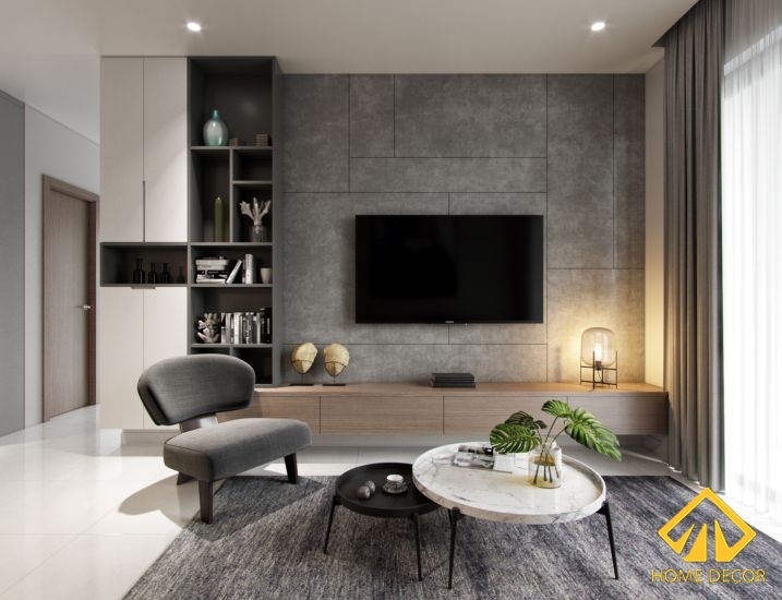 Tivi được gắn ở ngay trên tường nền xám còn bên dưới sẽ là kệ tủ tivi dáng chữ nhật thon dài dọc theo chiều rộng của tường. Nhờ có thiết kế kệ tủ tivi độc đáo như vậy mà vừa tăng thêm nét đẹp cho căn nhà, mà đồng thời cũng mang đến nhiều tiện lợi cho gia đình anh Dũng. Để khu vực tivi không bị quá trống trải nên Home Decor đã lắp đặt thêm cùng một món đồ gỗ nội thất tủ dáng dọc, với chiều cao áp sát trần.