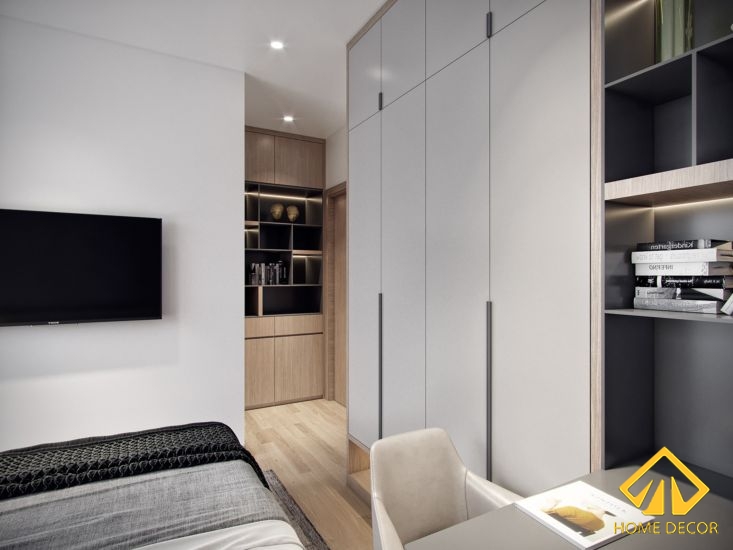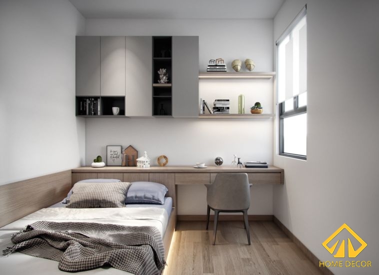 Đồ nội thất đặc biệt và ấn tượng nhất chắc chắn chỉ có thể là bộ giường tủ kết hợp bàn học. Hầu hết toàn bộ đồ nội thất trong hợp nhất lại thành một, vừa tiết kiệm được không mà cũng mang đến nét đẹp tối giản, hiện đại và tiện lợi trong đây. Bộ đồ gỗ nội thất này chứa đựng khu vực giường nhô lên, trước mặt sẽ là tủ quần áo cửa kéo ngang. Còn bên cạnh giường sẽ là bàn học, bàn làm việc nhỏ gọn được liền kề từ phần đầu thành giường đến hết tường.