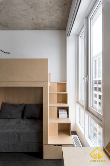 Chiếc giường tầng là sự lựa chọn hoàn hảo để tiết kiệm được không gian và chi phí. Tầng bên dưới có thể đặt giường ngủ hoặc chiếc đệm ngồi để chơi, đọc sạch,..đều được. Cầu thang đi lên được đặt sát với cửa sổ để lên tầng 2 là nơi giường ngủ chính của bé.