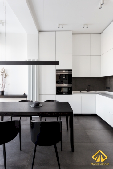 Khác hoàn toàn so với phòng khách toàn màu đen tối giản thì tại đây, trong căn phòng bếp nấu nướng này được phủ bằng tone màu trắng và duy nhất điểm một vài chi tiết bằng màu đen mà thôi.