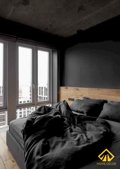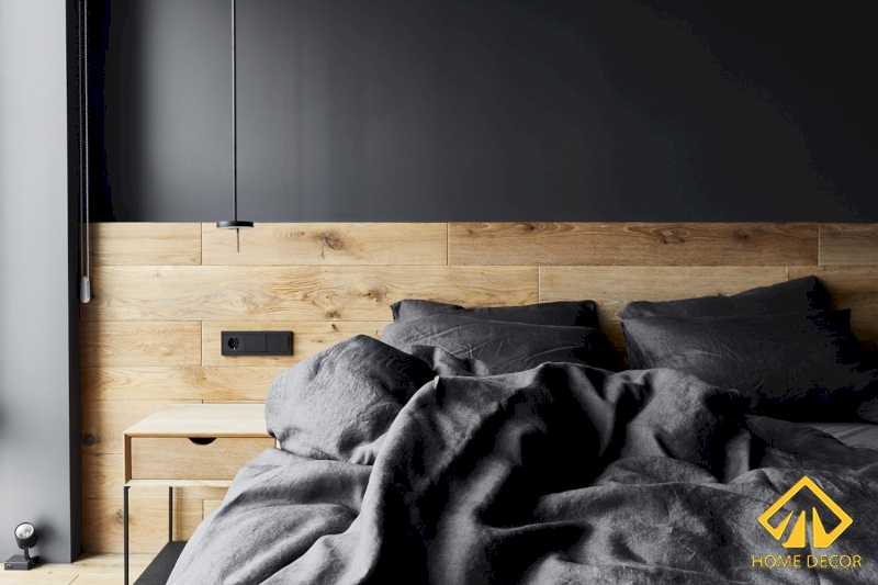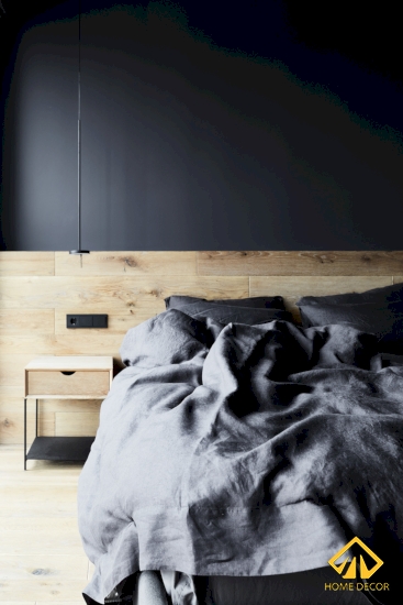 Đầu tiên Home Decor sẽ nói đến căn phòng ngủ lớn của bố mẹ, tại đây chúng tôi giữ nguyên các sắc đen và nâu gỗ tối giản làm chủ đạo. Nền sàn được lát bằng chất liệu gỗ tấm màu nâu sáng và để tạo nên được sự đồng nhất chung cho cả phòng nên Home Decor tận dụng ngay tấm gỗ đó để làm vách đầu giường. Chiếc giường ngủ trong phòng lớn này là dáng giường bằng gỗ bọc vải thô màu đen xám.